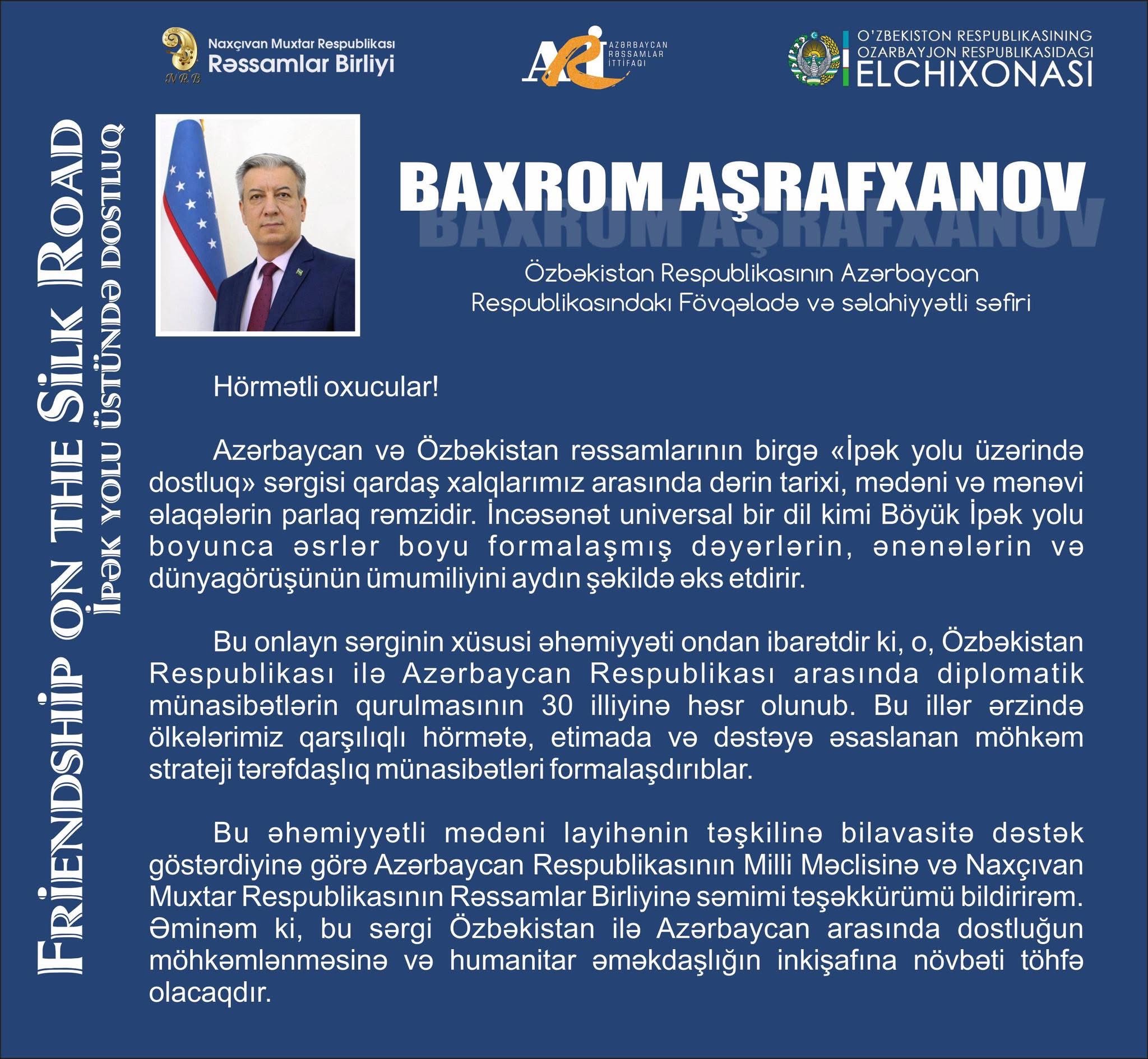 Özbəkistan Respublikasının Azərbaycan Respublikasındakı fövqəladə və səlahiyyətli səfiri Baxrom Aşrafxanov giriş sözündə layihəni iki qardaş xalq arasında dərin tarixi, mədəni və mənəvi əlaqələrin parlaq rəmzi kimi qiymətləndirir: “İncəsənət universal bir dil kimi Böyük İpək yolu boyunca əsrlər boyu formalaşmış dəyərlərin, ənənələrin və dünyagörüşünün ümumiliyini aydın şəkildə əks etdirir. Bu onlayn sərginin xüsusi əhəmiyyəti ondan ibarətdir ki, o, Özbəkistan Respublikası ilə Azərbaycan Respublikası arasında diplomatik münasibətlərin qurulmasının 30 illiyinə həsr olunub. Bu illər ərzində ölkələrimiz qarşılıqlı hörmətə, etimada və dəstəyə əsaslanan möhkəm strateji tərəfdaşlıq münasibətləri formalaşdırıblar. Bu əhəmiyyətli mədəni layihənin təşkilinə bilavasitə dəstək göstərdiyinə görə Azərbaycan Respublikasının Milli Məclisinə və Naxçıvan Muxtar Respublikasının Rəssamlar Birliyinə səmimi təşəkkürümü bildirirəm. Əminəm ki, bu sərgi Özbəkistan ilə Azərbaycan arasında dostluğun möhkəmlənməsinə və humanitar əməkdaşlığın inkişafına növbəti töhfə olacaqdır”.
